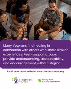 Many Veterans find healing in connection with others who share similar experiences. Peer-support groups, both in-person and virtual, provide understanding, accountability, and encouragement without stigma. They also create a sense of community which can be lost when soldiers return home.